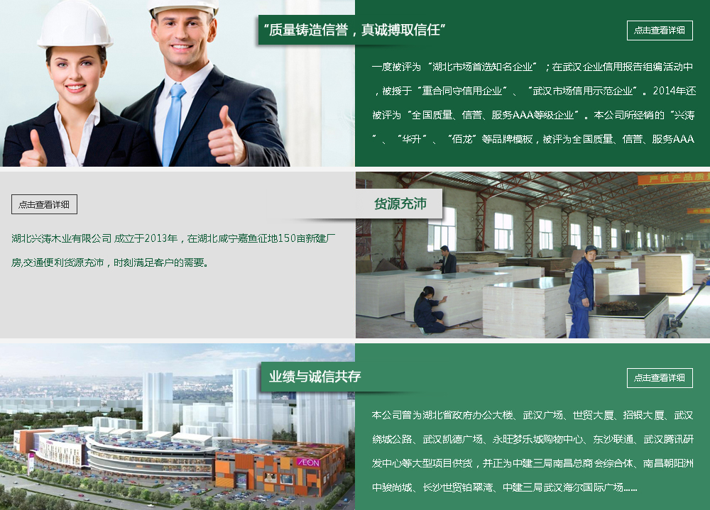 湖北興濤木業(yè)有限公司成立于2013年,在湖北咸寧嘉魚征地150畝新建廠房,公司立足于武漢地區(qū),業(yè)務(wù)輻射湖北及周邊地區(qū),多年來致力于木枋、模板批發(fā)業(yè)務(wù),公司以“質(zhì)量鑄造信譽(yù),真誠搏取信任”為宗旨,以多品種、低價(jià)格、優(yōu)質(zhì)量深受廣大客戶的青睞,是一家在木枋模板行業(yè)中處于優(yōu)秀地位的廠家。公司一度被評(píng)為“湖北市場知名企業(yè)”;在武漢企業(yè)信用報(bào)告組編活動(dòng)中,被授于“重合同守信用企業(yè)”、“武漢市場信用示范企業(yè)”。2014年還被評(píng)為“全國質(zhì)量、信譽(yù)、服務(wù)AAA等級(jí)企業(yè)”。本公司所經(jīng)銷的“興濤”、“華升”“佰龍”等品牌模板,被評(píng)為全國質(zhì)量、信譽(yù)、服務(wù)AAA等級(jí)品牌模板。